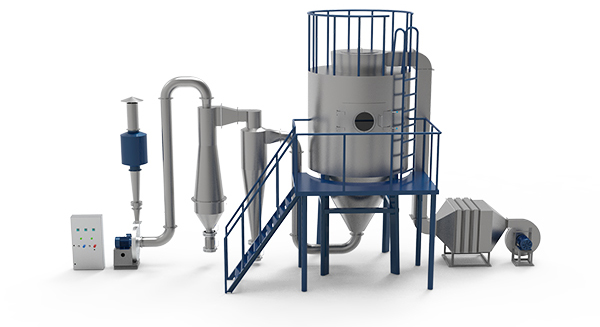 空氣通過過濾器和加熱器,進入離心噴霧干燥器頂部的空氣分配器,熱空氣呈螺旋狀均勻進入干燥器。料液由料液槽經過濾器由泵送至干燥器頂部的離心霧化器,使料液噴成極小的霧狀液滴,料液和熱空氣并流接觸,水分迅速蒸發,在極短時間內干燥成成品,成品由干燥塔底部和旋風分離器排出,廢氣由風機排出。用戶可根據實際情況選定加熱方式和收塵、除塵方式。